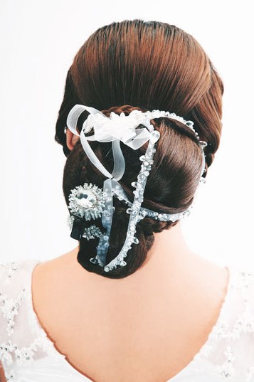 浪漫法式辫:正面用蜈蚣辫打造立体纹理感的刘海儿,背面用美丽的水晶丝带缠绕在固定好的发包上显得十分抢眼,马上摆脱老气沉重感,温婉烂漫感立即出现。侧面刘海儿的完美弧度能更好地修饰脸型,令整个发型显得端庄优雅。