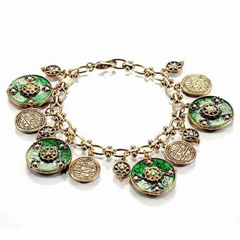 金色手链上坠满了圆币,金色与绿色圆币大小交替排列,圆币上的花纹精美且富于变化,在大气中流露出精致。爱心形的图案与圆币图案相搭配让新娘的腕间绽放奢华的复古风采,显的新娘的腕间更加的修长。