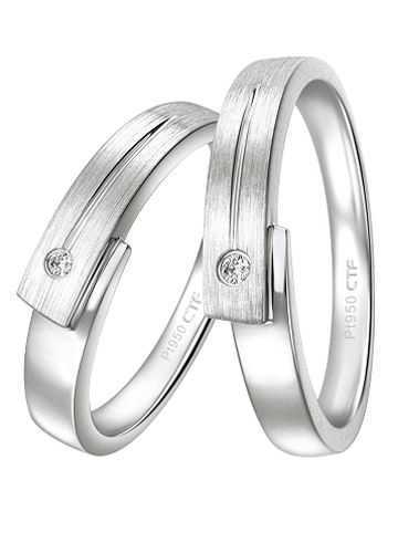 周大福怀着祝福的心愿,精心打造每一对铂金对戒,率先采用整环套切特别工艺:女款戒胚自男款戒胚种套切而来,你中有我,我中有你,契合无间,就像夏娃生自亚当心脏旁的那根肋骨;造型简洁洗练,充溢着时尚气质;环壁薄厚适中,更显优雅精致;内环内弯式设计,让佩戴更舒适;以精湛工艺细心打磨,散发迷人光泽。每一对婚戒都如此完美,等待着每一个完美爱情的来临。