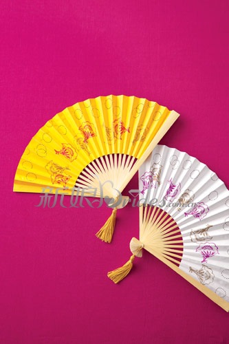 在炎热的夏季举行户外婚礼,怎么少得了一把轻巧的纸扇?在每位来宾的座位上放置一把自制纸扇,让宾客们都体会到你的别具匠心和体贴。心灵手巧的新娘们不妨DIY一份实用别致的回礼可以让来宾对婚礼印象深刻。