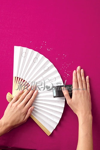 1、 打开纸扇,一手按在扇骨处将其展平,一手用圆形打孔器随机分散地在扇面上打出小孔。