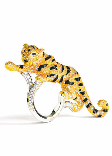 孟加拉虎化身为项链、戒指或胸针。珍贵的黄色钻石、黑色缟玛瑙、18K黄金,显示着尊贵霸气的王者风范。