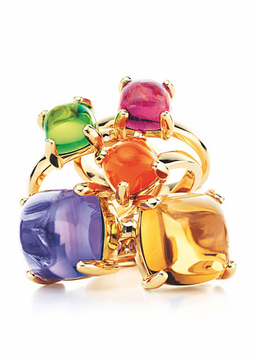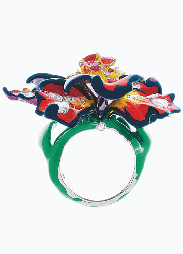 18K黄金和纯银与色彩艳丽、极富生机的红色、蓝色、绿色或橙色珐琅栩栩如生地展现在珠宝作品之上。单独佩戴或是与同系列其它色彩的戒指层叠搭配,缤纷呈现。