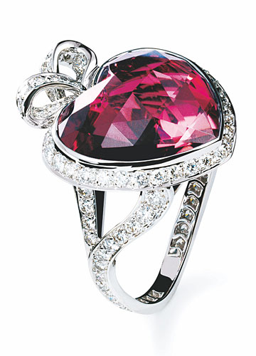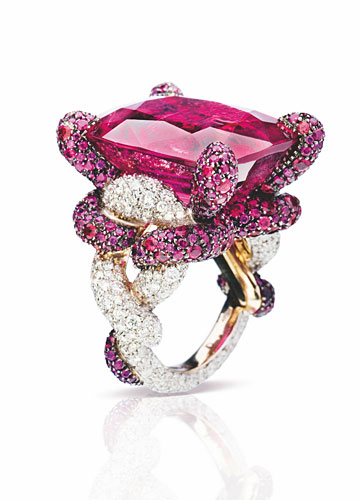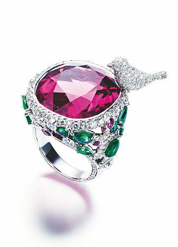 在伯爵珠宝的花园里,闪烁的常春藤蜿蜒缠绕,仿佛柔软的蕾丝花边。红碧玺的钻石指环所散发的闪耀光芒,碧玺的磁场还对人体有益,敢问谁能不屈服?