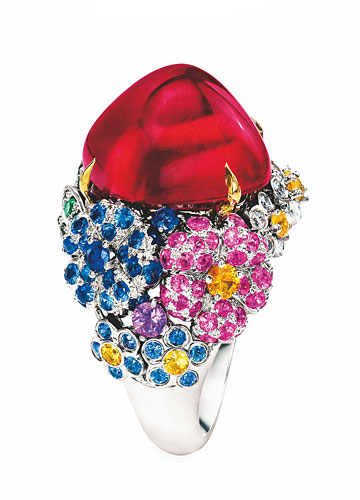 Christina Dior的高级定制珠宝系列,碎钻镶嵌大颗彩色宝石、醒目华丽的戒指。像是参加公主们的聚会。佩戴珠宝的公主优雅地拿起酒杯,指间便会绽放炫目光芒。