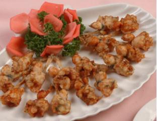 石鳞20只,于淀粉10克,青椒、红、绿樱桃各2只,香油适且,味糟、惹、姜各少许