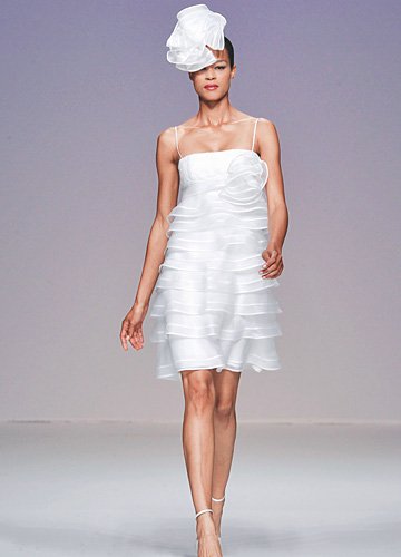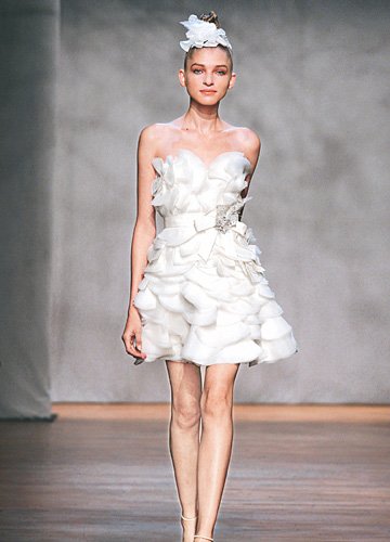 层叠有型的轻纱营造花瓣的梦幻气氛,组合成俏皮超短A字裙摆,高腰的精致腰身设计,勾勒完美的黄金身材比例,露出修长美腿。梦幻花瓣头饰与裙身遥相呼应,甜美而柔美。