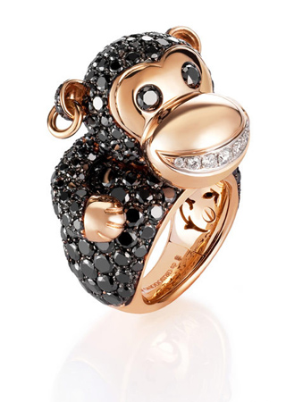 小猴造型戒指:玫瑰金与黄金戒指镶嵌317颗黑色钻石重10.19克拉,另有七颗白钻石重0.18克拉。
