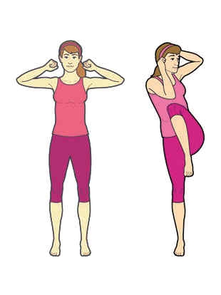 一、扭动躯干。1.双脚保持30厘米宽,站立。双臂抬高,肘部弯曲,双拳抵双耳。2.左膝抬高,移向右肘,同时扭动身体躯干。身体复位后,动作重复30秒。然后换一侧重复动作。