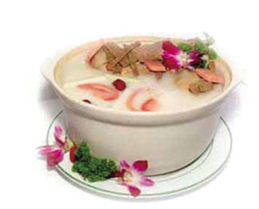 金银花25克,水鸭1只,无花果2粒,陈皮1/4片,鲜姜2片,清水1000毫升,盐少许。做法:金银花洗净,水鸭洗干净后放入滚水内煮5分钟,取出;陈皮洗干净、泡软刮去囊;清水1000毫升煮沸,将金银花、水鸭、无花果、陈皮、姜加入煲滚,改用文火煲两个小时,加盐调味。此汤具有清热解毒之功效。