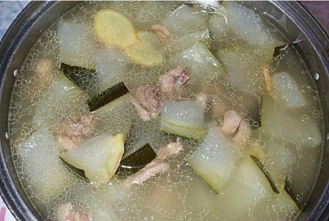 老冬瓜1块(约800克),水鸭1只,扁豆、干莲蓬、灯心草各适量。做法:冬瓜连皮切块,其他材料洗净。上述材料放到锅里加水,大火烧开后收小火,煲两小时,加盐即成。注意:煲的时候冬瓜不要去皮,吃的时候建议不要吃;扁豆、干莲蓬、灯心草、水鸭的骨头,都不建议吃。