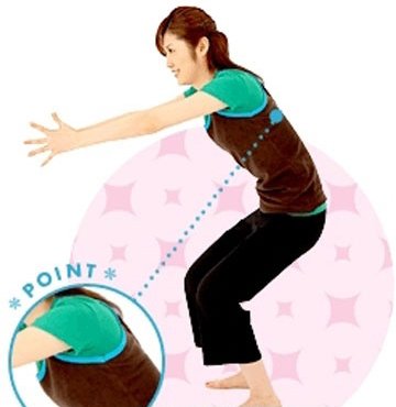 3、双膝往前弯曲,臀部下沉,上身微微前倾,令上身、大腿、小腿两两成90度,双臂伸直下摆,边呼气边摆向左侧击掌,定住保持3秒后,恢复仰身的姿势,再在右侧击掌。