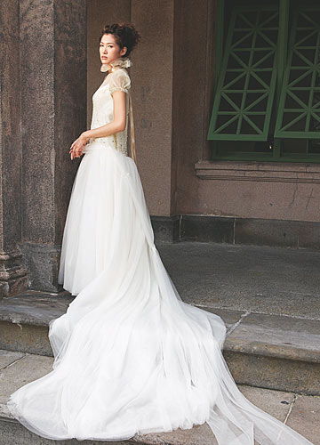 最娇柔的女人味,甜而不腻,用柔软的线条包裹着女性纤弱的身体,轻纱能堆叠出各种我想要的空间形态,它们形成了光影的游戏效果,让更多浪漫的柔光呈现出来。不去刻意地修饰身材曲线,更能让新娘显得年轻。