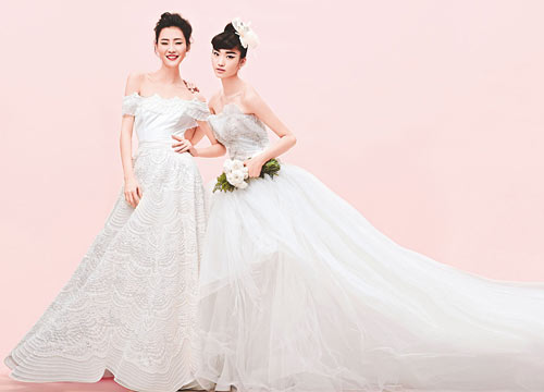 婚纱依旧是公主梦的最好诠释,左边的款式是特殊上身的卡肩设计,突显的是小公主的气质,全手工打造的珍珠图案。在缝制细节上拒绝了呆板,虽然花纹繁复,但素雅统一的色调能让新娘呈现出清新的样貌;右边的裹胸婚纱,我们为了制造出若隐若现朦胧感的浪漫,胸口用了与裙摆同样材质的不规则软纱装饰,金色刺绣图案很是细腻,我希望在尽可能呈现夏日新娘清爽感的同时,我的奢华小细节看起来更加低调。