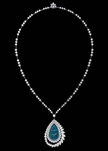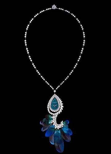 此件高级珠宝腕表的极品,由一枚项链表和一件可拆分的胸针或吊坠扣合而成。统共镶嵌 191颗、总重62.35克拉钻石,再缀以14根孔雀翎羽。著名的“Cluster”三维立体镶嵌手法,由中心向外扩散外放,让钻石最自然、純粹的一面表现无遗。
