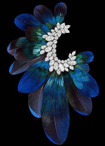 如同拥有色彩斑斓柔顺羽毛的孔雀,向众人展示其优雅姿态,这款旋转式胸针由26颗榄尖形钻石、5颗梨形钻石和10颗明亮式切割钻石镶嵌而成,仿佛孔雀轻展尾翼在刹那间展示艳丽羽毛,点缀其中的宝石闪亮异彩,犹如绚烂绽放的花冠,又如展翅欲飞的翅膀。