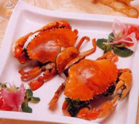 2、锅置中上火,放入适量花花生油,将红蟳下锅,两面翻煎,其问加数次少量水至熟后,滗去油,泼入绍兴酒翻动起锅。