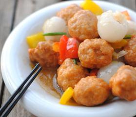 7、放入荔枝肉、丸子,将花椒粉、鸡精、盐、蚝油、水淀粉调成汁倒入。