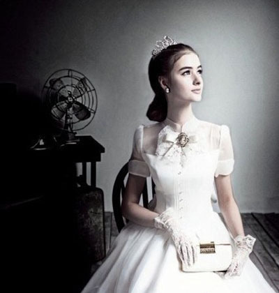 复古的婚纱,有着难以言喻的美感。小竖领和特别的肩部设计,充满了淑女的美感。胸前金属扣上的蝴蝶结,端庄又美丽。婚礼的神圣感体现在蕾丝手套和珍珠耳环还有水晶皇冠上哦。