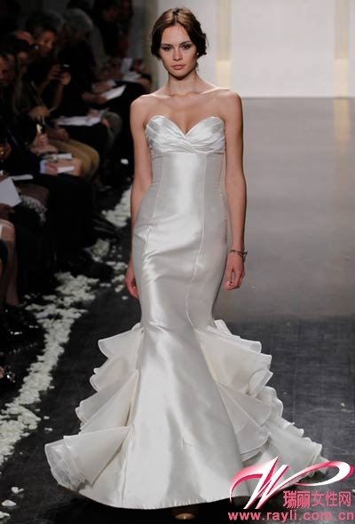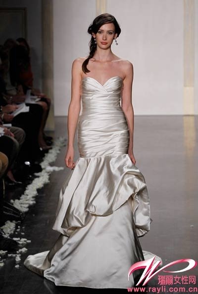 这一季,Tara Keely除了通过高超的立体剪裁,让鱼尾款式更加性感外,更是善于立体褶皱在身上不同部位的应用,达到塑造魔鬼身材的效果。上半身褶皱交叉的设计最能塑造完美胸型,贝壳形的感觉让胸部更加丰满,宽腰带勾勒玲珑腰身。裙摆上立体褶皱的纵向装饰,只是通过简单的排列呈现出整齐又富有动感的状态,使裙身与细腰比例更加明显,魔鬼曲线也就完美呈现啦,设计很是巧妙。