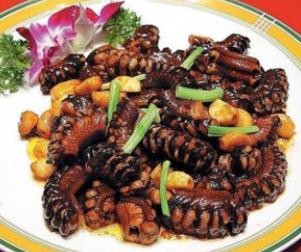 3)留底油,随即投入葱、姜煸香,把五花肉放入稍煸一下,将料酒烹入,加进酱油,待肉上色后,再加上糖和适量的水把肉用小火焖至3~4成熟,再加入鳝段、大蒜继续小火焖50~60分钟,全烂时加入味精、盐、改用旺火收浓汁,最后淋入香油拌匀便成。