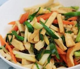 1、大蒜清洗净后切成段。胡萝卜切成长条。豆干切成条。