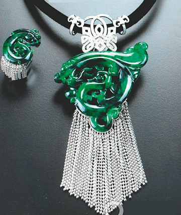 L’Ecrin 的设计师选用老坑翡翠,以腾云龙作为设计主体,里双扣蝙蝠同“福”,下缀中国结寓意吉祥如意,又以18K 白金流苏塑造腾云驾雾之感,更代表灵动的绵延之水。