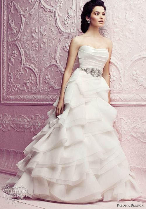 柔软的层叠薄纱质感十足,齐地的裙摆适合身材娇小的新娘。