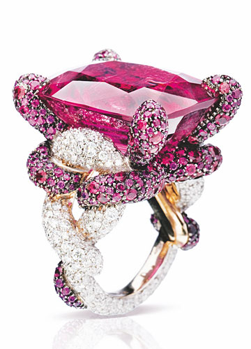 设计灵感:以Cosmopolitan柯罗波丹调酒为灵感,镶嵌1颗15克拉枕形切割粉紅色碧玺,及1颗3.0克拉雕刻黃水晶。