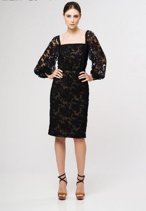 方形领口蕾丝礼服,适合成熟的伴娘。黑色的蕾丝,神秘而性感。