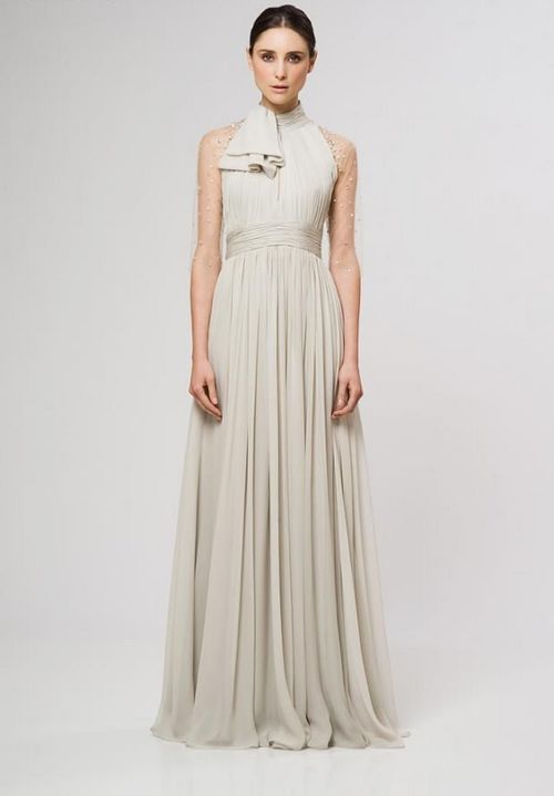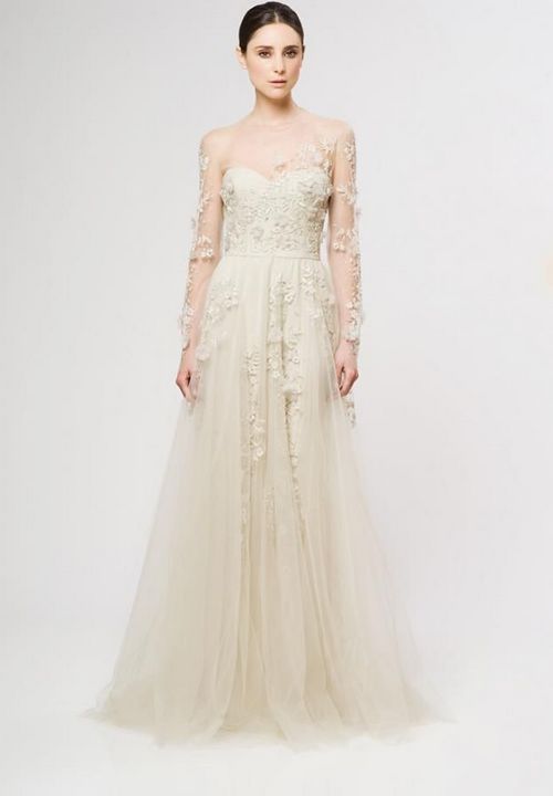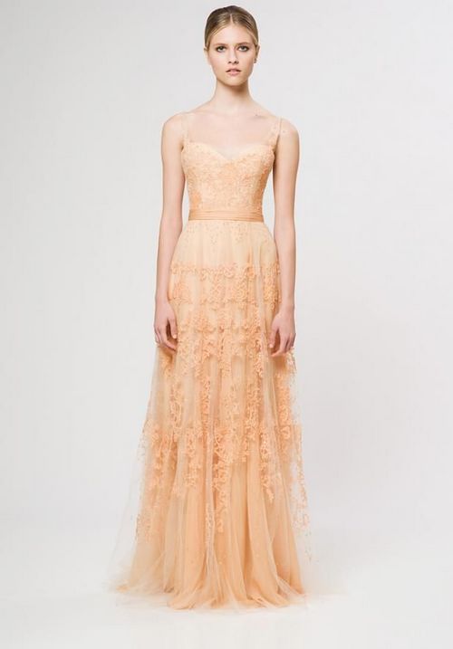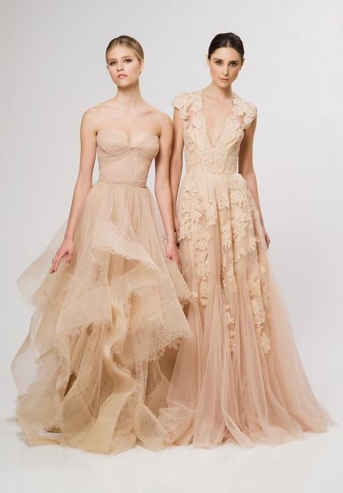 裸色最让人青睐的还是它那种若隐若现夹杂诱惑的真实感。所以,当一片艳丽色彩中那一抹独具一格、紧贴身体线条的裸色婚纱礼服,宛若第二层肌肤般恣意展示着女人的娇媚。将裸色元素巧妙的与新娘婚纱融合在一起,让新娘的柔美气质展现的淋漓尽致!