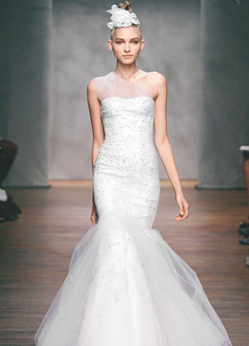 包身的缎面鱼尾将好身材显露无遗,清透纱质营造朦胧而柔美的空气感,晶莹水钻点缀全身,营造如同深海人鱼版梦幻唯美气质。