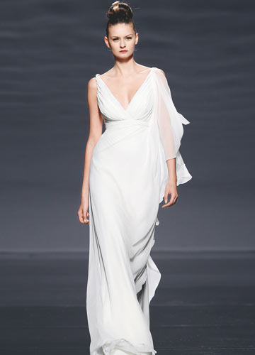 深V设计与鱼尾裙摆勾勒性感身形,立体花朵点缀增加精致细节看点,收紧的宽版腰带勾勒出身材的黄金比例。朦胧而高贵的新娘形象立显。