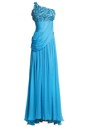 3. 而室内婚礼,为映衬新娘婚纱的奢华,丝缎蓝宝石光彩的单肩礼服裙,是伴娘的最佳选择。