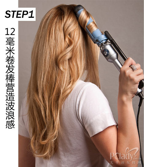 先将头发洗干净,吹干之前在发根至发梢喷点护发喷雾。头发吹干后,用12mm的发卷将头发卷出发卷,营造出更好的波浪纹理效果,再用手指随意将卷好的大波浪打散。