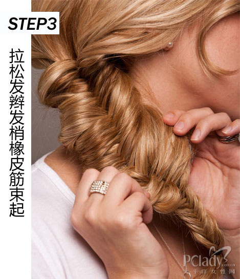 将发辫拢到一侧,用手指轻轻拉松编好的发辫,然后用橡皮筋扎上发梢。