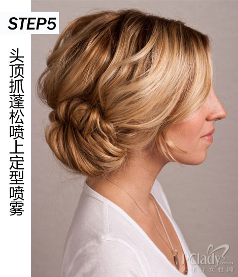 将发辫盘起固定成发髻,用大量发夹固定好发卷,轻轻拨乱头顶头发,然后在头发上喷上定型喷雾,让其更显柔美且不易凌乱。