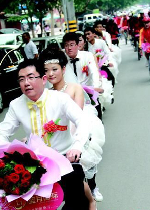 新郎王林告诉记者,他和新娘以及其他三对新人都是自行车俱乐部的成员,为了让自己的婚礼脱俗,平时爱好骑自行车的他,就计划来这样一场迎娶新娘的婚礼。为了这场婚礼,队友们非常积极地组织了这支由百辆自行车组成的迎亲花车队。