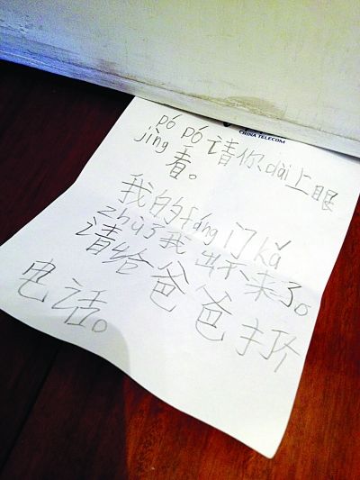 记者看见,坠楼窗口位于宣宣家的书房,书房门还反锁着没能打开。外婆告诉记者,她回家后发现外孙事发前写了一字条求救。字条内容是:“popo(婆婆),请你dai(戴)上眼jing(镜)看,我的fang(房)门ka(卡)zhu(住)了,我出不来了,请给爸爸打电话。”孩子刚读小学一年级,很多字都是用拼音代替的。