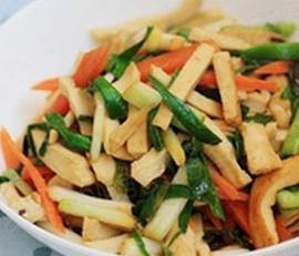 1、大蒜清洗净后切成段。胡萝卜切成长条。豆干切成条。