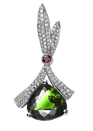 设计理念:鲜绿的碧玺带来盎然的生机感,而这些碧玺吊坠小巧精致的造型是每一个女孩的心头所好,垂坠的设计自然、别致。