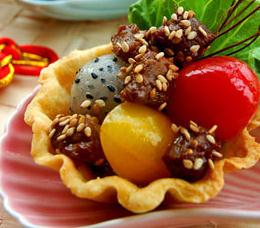 8、牛肉粒、水果粒一起盛入菊花金盏装饰即可食用。