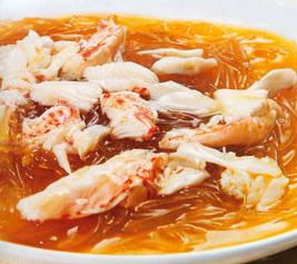 (3)起锅加上汤300g,海虎翅滤干放入。加蟹肉100g,料酒10g,精盐2g,味精1g,鸡粉2g烧开。用稳定生粉勾琉璃芡,撒胡椒粉即可装盘。