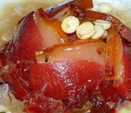 用料:金华火腿中腰峰雄爿(带皮、熟料)、通心宣莲子、菠萝丁、蜜饯樱桃、糖桂花、料酒、冰糖、湿淀粉。
