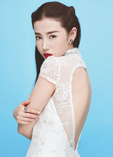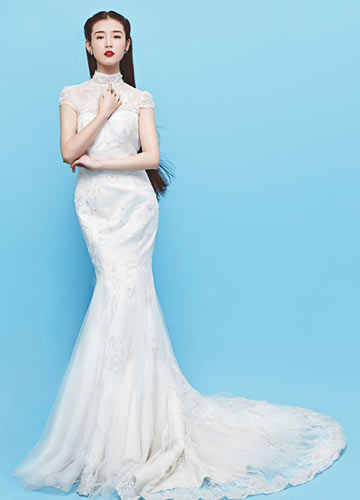 像旗袍一样婀娜多姿的嫁衣:蕾丝立领和鱼尾裙并不是这件婚纱的全部,后面是风情无限的蕾丝与露背,还有那一颗颗严谨的丝缎小纽扣,传达着绝对复古的文艺情结。