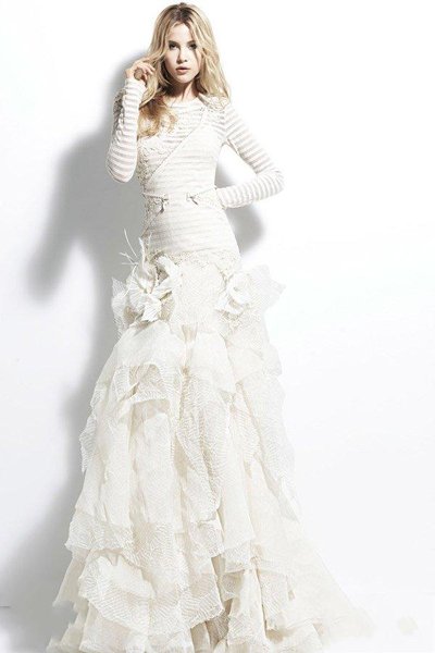 长袖婚纱并不多见。这款长袖婚纱采用时下流行的斑马条纹图案,时尚新颖。
