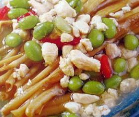 1、黄花菜洗净摘去腐梗,用沸水汆熟,再用冷水过凉备用,青豆汆去豆腥味。