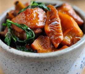 鸡中翅10个、春笋2支、米酒6汤匙、酱油3汤匙(其中老抽1汤匙,生抽2汤匙)、香麻油2汤匙、冰糖10颗(约15g)、九层塔叶一小把,一汤匙食用油、姜片(一汤匙=15ml)。