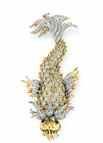 爱情无论在什么年代,无一例外,都是那么的美好。当初涉爱河的韦尔斯利大三学生玛德琳收到作为爱情信物的男大学生联谊会Theta Delta Xi 徽章,她的父亲恭喜这名幸运的男生“钉住了玛德琳”。一直到步入教堂,这枚徽章让她度过了使她在女友们面前飘飘然的大学最后时光。而最甜蜜的则是她收到先生送的结婚礼物,一枚嵌有祖母绿眼睛和红宝石鱼鳞的鱼型胸针,背面是一个表示无穷大的符号,这个暗示最终没有变成现实,当二十三年后他们的婚姻以离婚告终,但在这二十三年中,这枚胸针所寓意的爱情意味,足以成为珍藏一生的美好怀念。谈到胸针爱好者,不得不提到另一个女人,传奇女星伊丽莎白· 泰勒,胸针或许是潜藏在这个女人心底最温柔的记忆。她在和最爱的男人理查· 波顿的婚礼上,唯一佩戴的珠宝是一枚祖母绿钻石胸针;另一件1962 年理查· 波顿专门为她向Tiffany 订制的一枚硕大的海豚胸针,这件礼物让泰勒异常珍爱,因为该胸针的设计师正是当时有“珠宝诗人”之称的Jean Schlumberger,而泰勒是他的粉丝。1965 年理查· 波顿赠送的另一件由Jean Schlumberger 设计的钻石和蓝宝石镶嵌而成的 Fleur de Mer“ 海洋之花” 胸针,完美彰显其设计者的非凡艺术才华,并完美展现了其拥有者——伊丽莎白· 泰勒的迷人魅力之美。