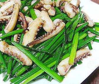 主料:水发鱿鱼200克,青韭100克
